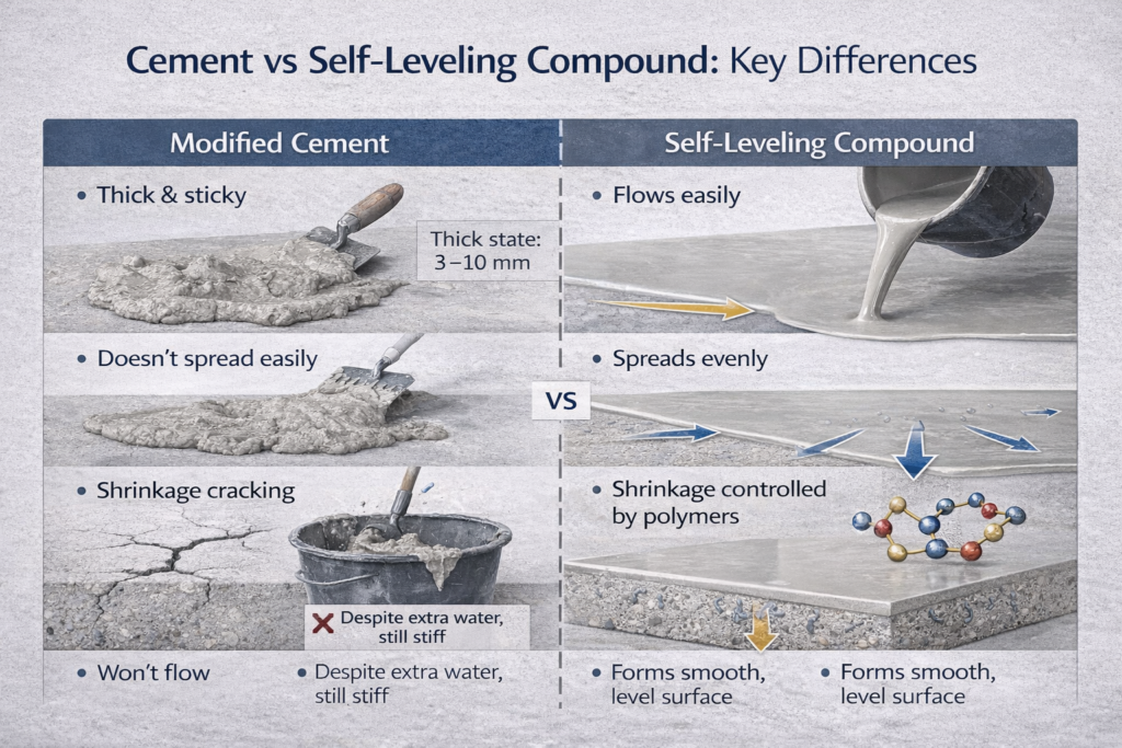 Self-leveling compounds are engineered blends of cement, fine aggregates, polymers, and additives designed to flow like pancake batter and harden into a smooth surface. Regular cement is only one ingredient in that system — not the finished solution.