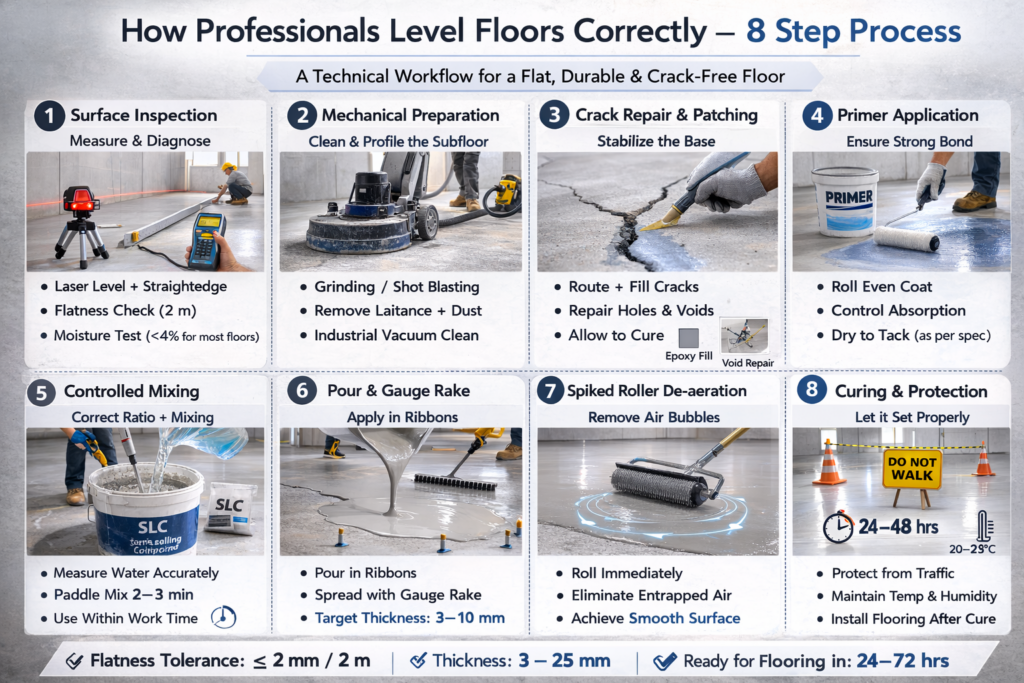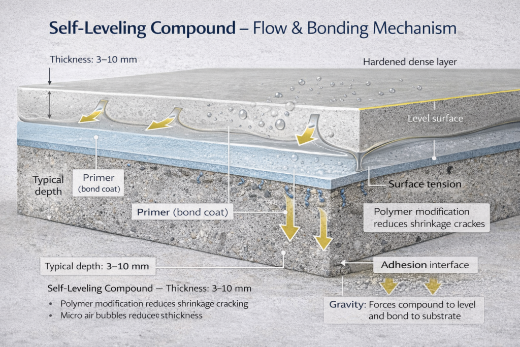 Self-leveling compound (SLC) is a specialized cement-based underlayment engineered to flow and settle into a flat surface with minimal manual finishing. It is not just “thin cement.” It is a chemically modified system.