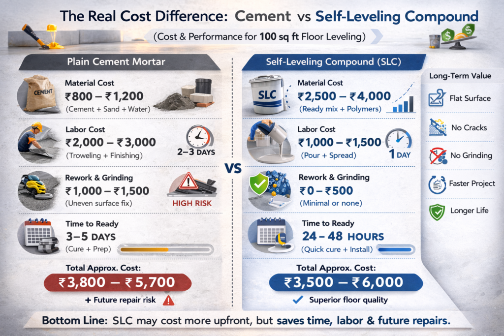 Professional installers rarely attempt thin leveling using plain cement because consistency cannot be guaranteed.