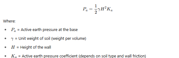 - Active Earth Pressure: The soil pushes against the wall but can move slightly to release some pressure.