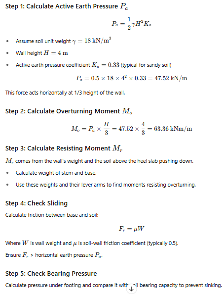 - Design for sliding, overturning, and bearing capacity to ensure the wall stays stable.
