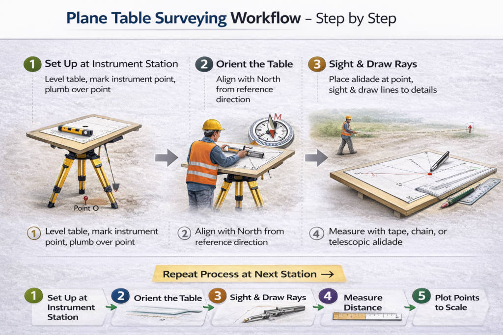 - Step 1: Set up the plane table at the central station. Step 2: Orient the table to true north using a magnetic compass. Step 3: Sight a target point with the alidade and place a ranging rod at the desired location. Step 4: Record measurements and annotations directly on the plane table.