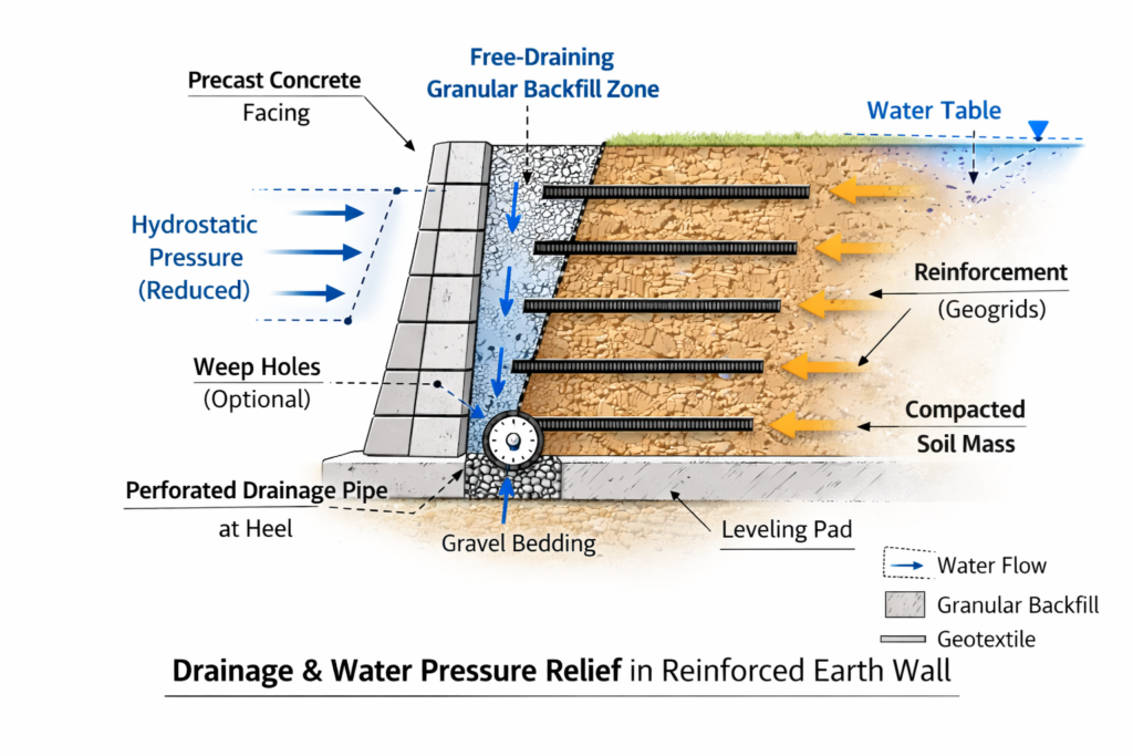 Use perforated drains and geocomposite filters behind facings to prevent hydrostatic buildup.