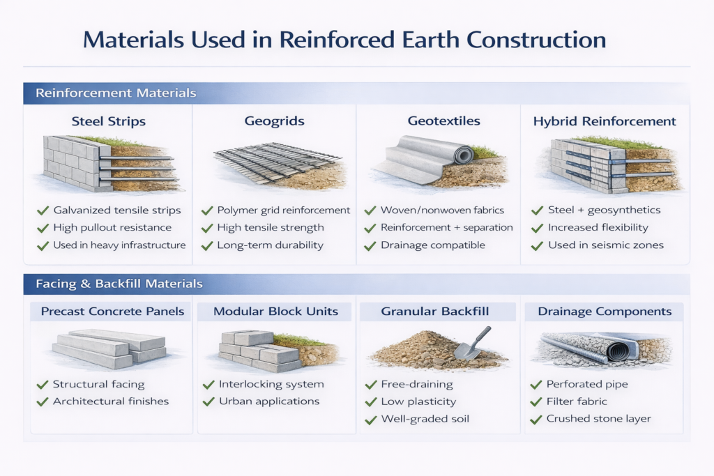 The performance of a reinforced earth structure depends heavily on material selection—both for the reinforcement and the fill.