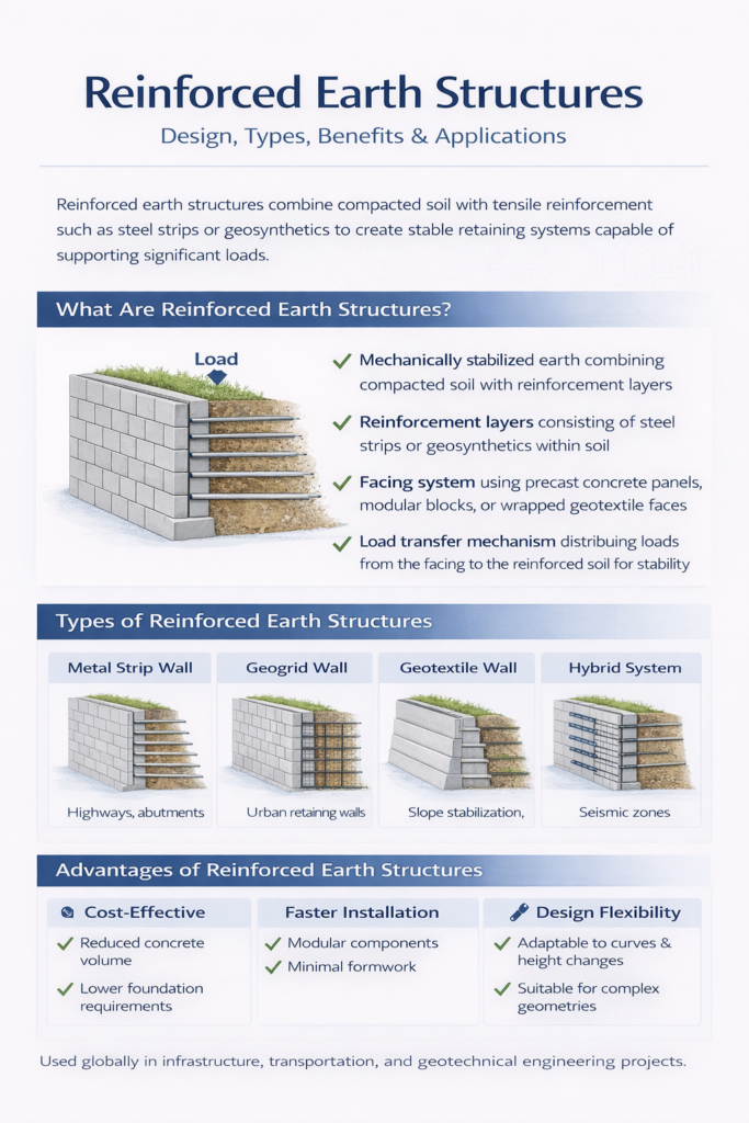 Reinforced earth structures combine soil with tensile reinforcements—like steel strips, geogrids, or geotextiles—to create a composite material that behaves like a strong, flexible, and economical wall or embankment. They’re used globally in highways, retaining walls, bridge abutments, and railways to resist lateral earth pressure and improve stability even on weak foundations.