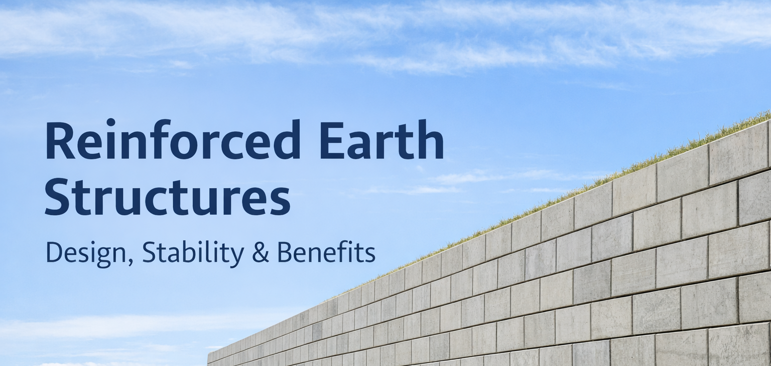 A reinforced earth structure (RES) is a mechanically stabilized soil (MSS) system where soil’s inherent strength is enhanced using tension-resisting materials such as galvanized steel strips, polymer geogrids, or geotextiles. The reinforced soil mass and facing panels act together to form a flexible, durable retaining structure.