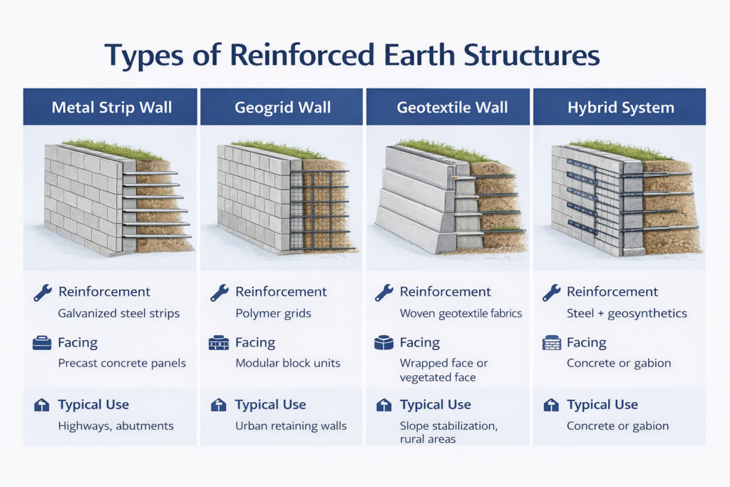 Reinforced earth systems vary depending on reinforcement type, facing type, and construction method. Broadly, they can be categorized as follows: