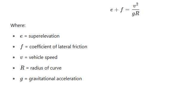 It’s based on vehicle speed, curve radius, and friction. Engineers use the formula:
